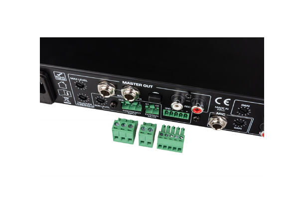 • Emergency message input (Euroblock connector) with automatic audio mute.
